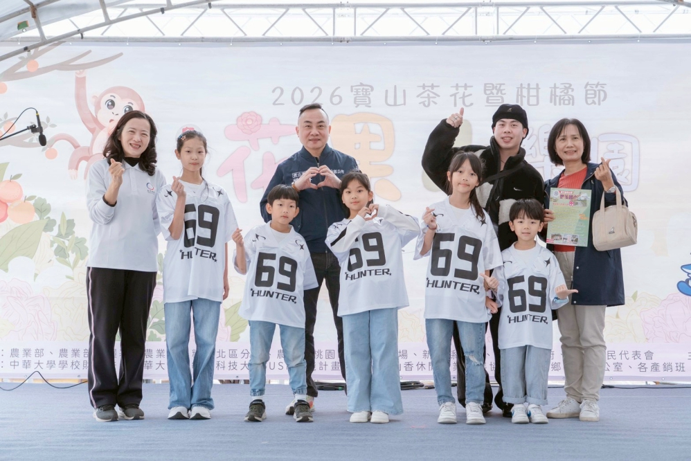 ▲竹縣寶山鄉公所「2026寶山茶花暨柑橘節」盛大登場,寶山鄉長邱振瑋(後排中間)和開幕表演的小朋友們合影。(圖/寶山鄉公所提供)