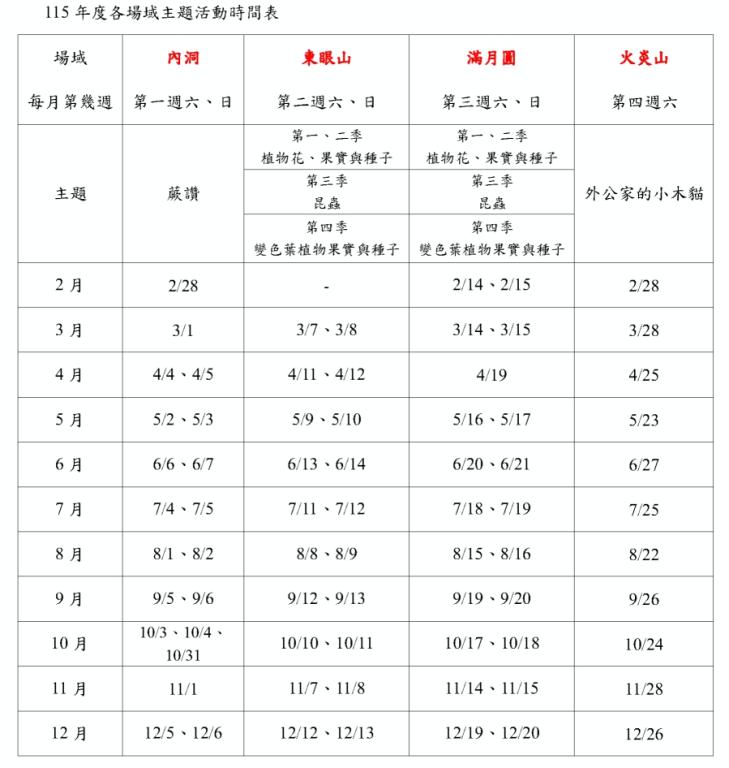 ▲林保署新竹分署所轄115 年度各場域主題活動時間表。(圖/林保署新竹分署提供)