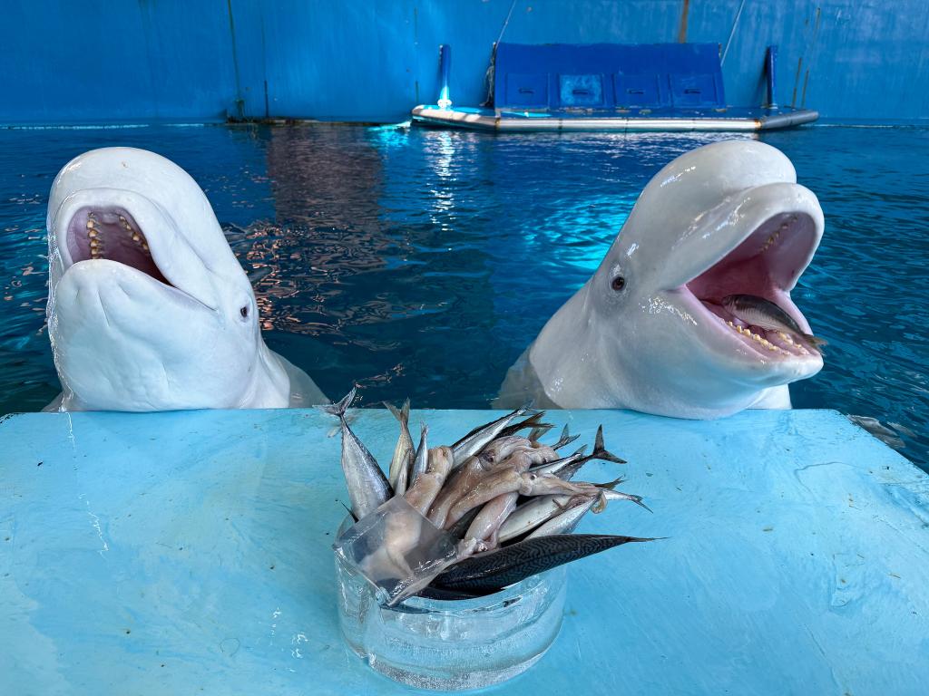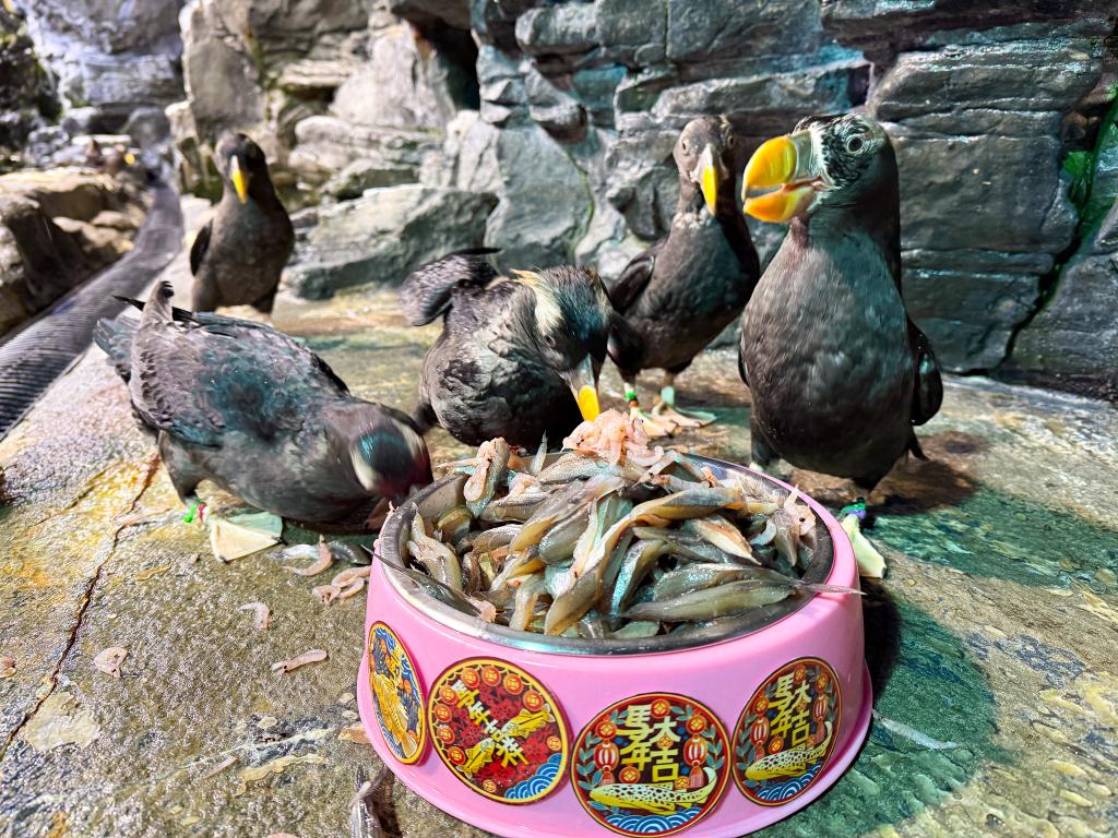 今年館內最受矚目團圓主角,非小白鯨莫屬,飼育員特別替牠們設計一份澎湃又清爽「海味拼盤」,嚴選多種魚種搭配富含水分的凍狀點心,並以特製冰皿盛裝,彷彿為牠們端上一桌沁涼年菜,開動前,白鯨早已在水中來回穿梭、頻頻探頭張望,模樣就像等著年夜飯上桌孩子,讓人忍不住會心一笑,來自南極企鵝家族則共享一桌圓滿造型「海鮮盛宴」,滿滿磷蝦與多樣魚料鋪陳成圓盤模樣,象徵團圓與豐收,企鵝們成群圍繞、此起彼落地啄食,畫面熱鬧又溫馨,是專屬牠們除夕圍爐。