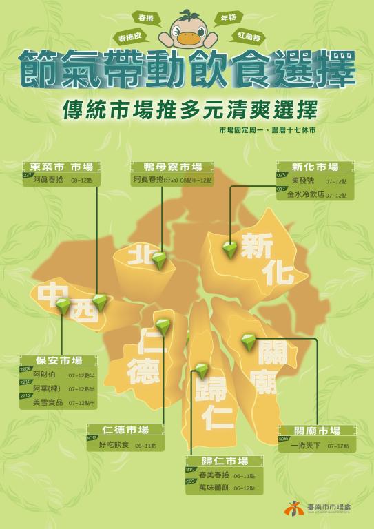【勁報記者于郁金/臺南報導】寒食節(清明節前一日)將近,民間習俗以清淡、少油、不需久煮飲食迎接節氣轉換,春捲與各式應景粿類也成為此時節桌上常見選擇;臺南公有零售市場向來貼近民眾生活,不僅保留傳統飲食樣貌,也隨著飲食習慣轉變,發展出多樣化輕食選項;為讓民眾在寒食節期間更容易認識市場中應景美味,臺南市市場處特別整理市場內具代表性春捲與清爽蔬食攤位,邀請民眾走進市場,感受節氣飲食自然風味。