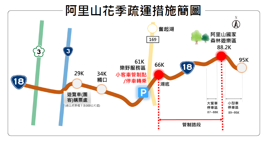 【勁報記者于郁金/嘉義報導】春遊去哪裡!阿里山花季於3月10日繽紛揭幕,花海持續盛開至4月10日,為確保旅遊品質及交通順暢,公路局於台18線阿里山公路66K湖底處至88.2K阿里山國家森林遊樂區實施交通管制措施,管制日期為3月14、15、21、22、28、29日及4月3、4、5、6日,共10天,並於每日上午6時至11時實施小型車管制。