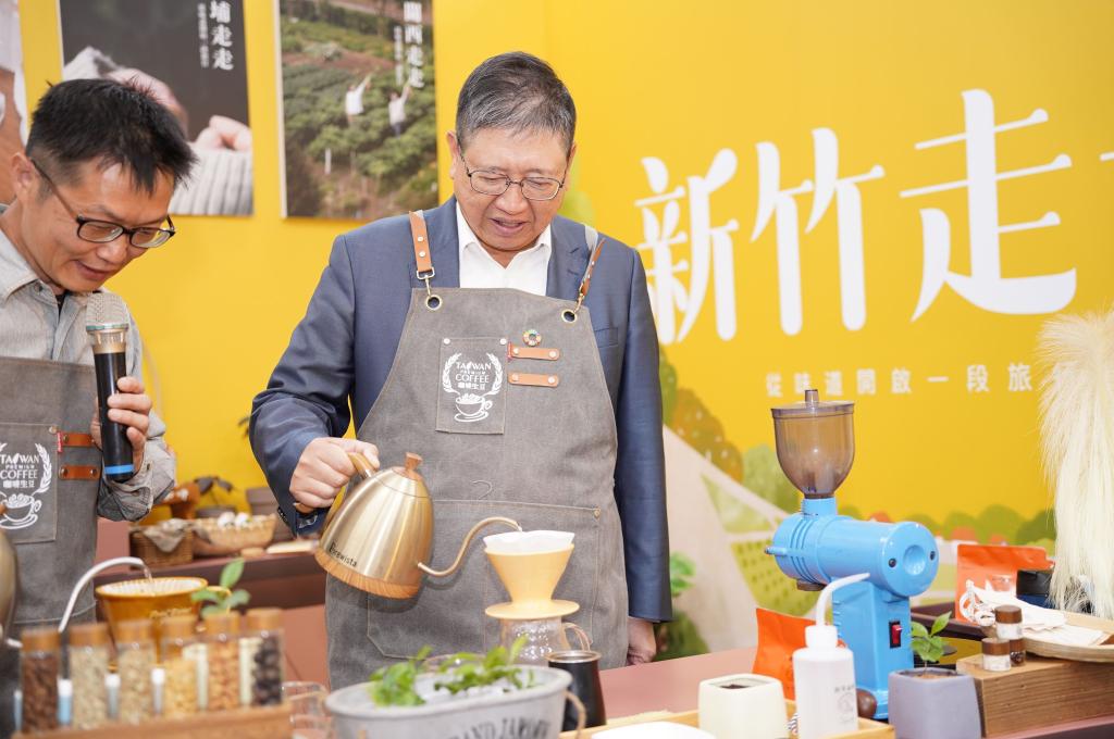 ▲竹縣府延續「循味」概念,「新竹走走」自4月到9月推出關西、尖石、新埔、峨眉全新四條遊程。楊文科縣長於宣傳活動現場搶先體驗手沖咖啡,感受新埔咖啡獨有香氣。(圖/竹縣府提供)