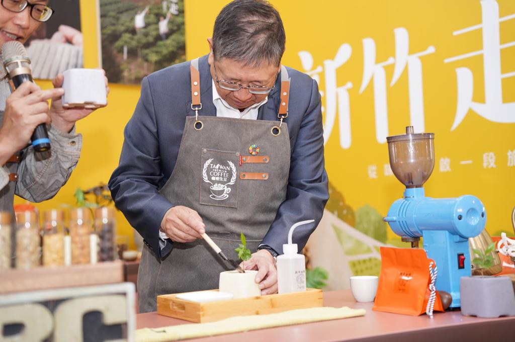 ▲竹縣府延續「循味」概念,「新竹走走」自4月到9月推出關西、尖石、新埔、峨眉全新四條遊程。楊文科縣長於宣傳活動會場上體驗栽種咖啡小樹苗盆栽。(圖/竹縣府提供)