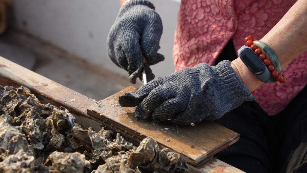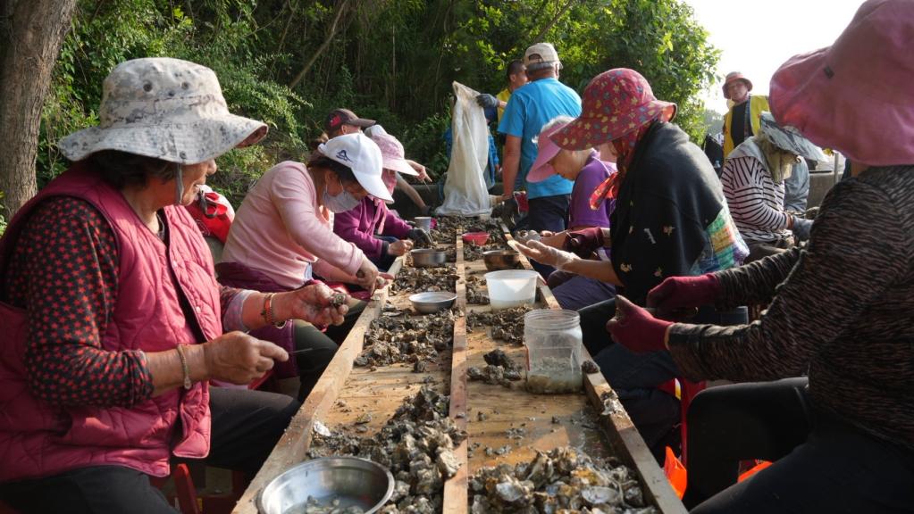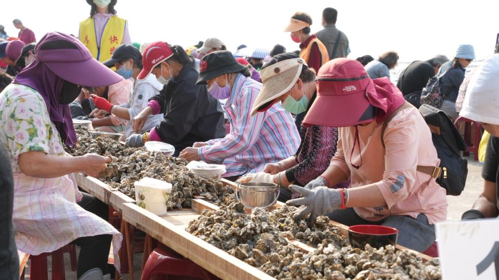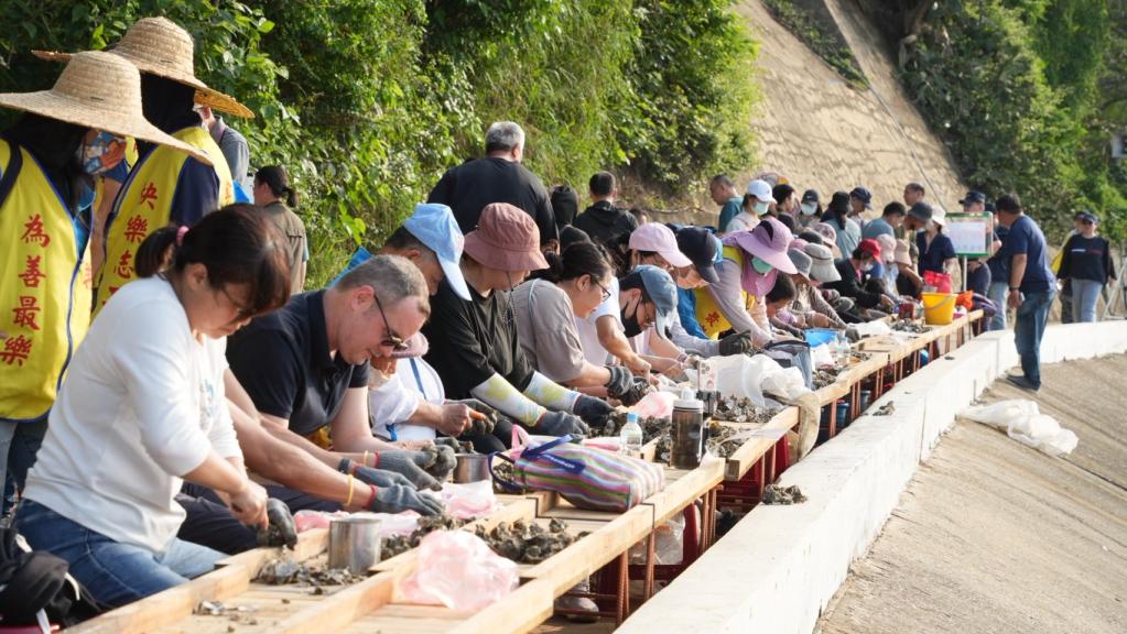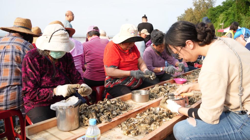 秘書長張瑞心與金寧鄉長楊忠俊等來賓,現場坐了下來,親自戴起手套、拿起蚵刀,一顆接著一顆剝起蚵來;千人剝蚵體驗活動現場,有不少是全家人出動,一起來享受親子同樂,上千人依然沒停下手邊動作,認真剝著蚵,也深切體會到蚵農辛苦。