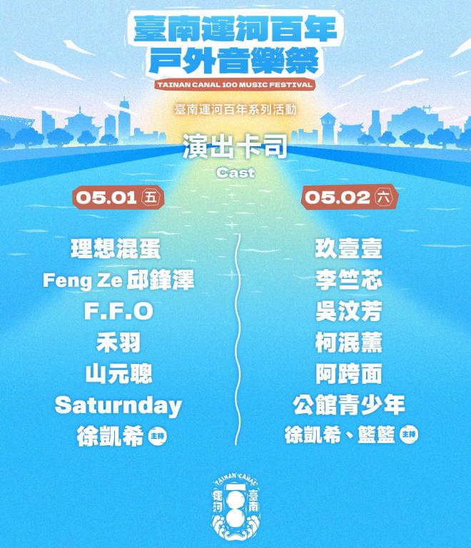 南市府表示,本次音樂祭卡司堅強,5月1日由理想混蛋、邱鋒澤等人氣歌手及樂團接力演出;5月2日則由玖壹壹、吳汶芳等多組藝人輪番登台,打造運河畔音樂盛宴。