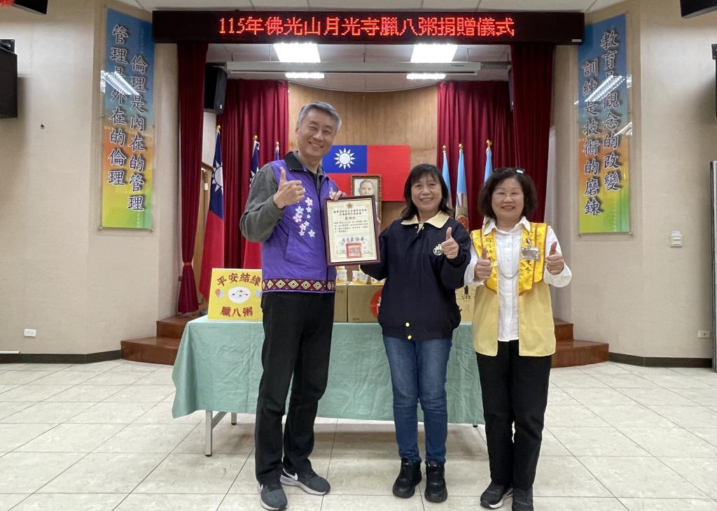 【勁報記者于郁金/花蓮報導】26日適逢臘八節(農曆十二月初八),佛光山月光寺特別與花蓮縣榮民服務處攜手合作,由花一分會許素玲會長、徐寶靜副督導長、廖美蓉督導等代表捐贈臘八粥,由花蓮縣榮服處蕭振嘉處長代表受贈,並回贈感謝狀表達謝意。
