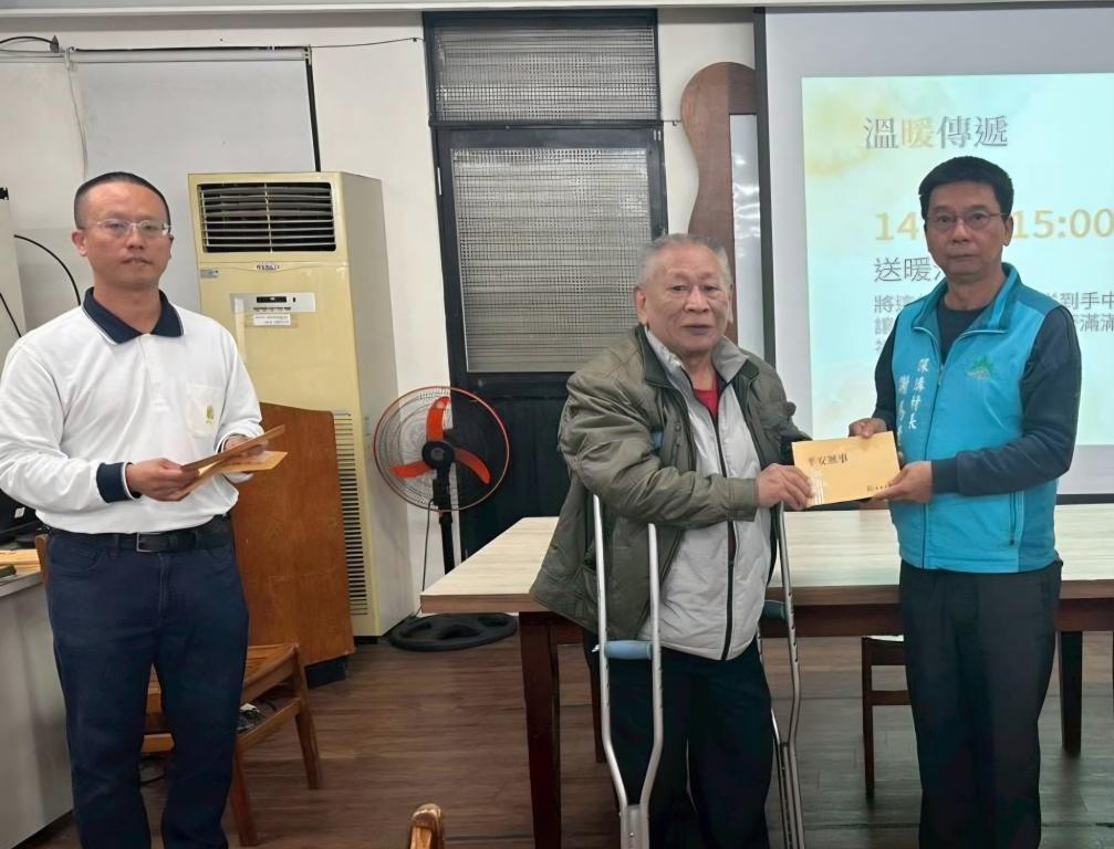 活動尾聲,由常實法師與張宜樺鄉長代表主辦單位,依序向與會鄉親致贈歲末關懷金及民生物資;紅包袋上印有「平安無事」祝福字樣,象徵法鼓山對鄉親們新一年美好祝願;透過10位義工現場服務與陪伴,期盼這份來自十方愛心,能讓每個家庭都能過個祥和好年。(于郁金翻攝/主辦單位提供照片)