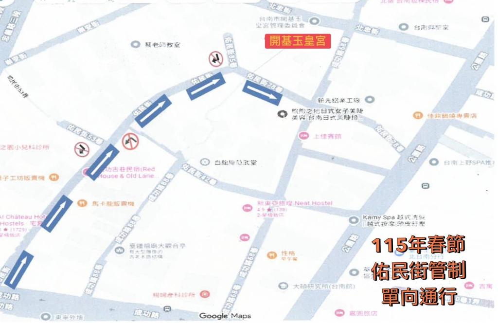 16日為除夕,夜晚將迎來參拜人潮高峰,許多民眾會選擇在子時前後走春祈福,為新的一年討個好兆頭。第五分局表示,已針對年節時段加強警力配置,視現場狀況彈性調整勤務,協助疏導人流與車流,維持廟埕及周邊道路的通行順暢,讓民眾能安心參拜、平安返家;此外,因通往開基玉皇宮佑民街路幅狹小,自16日18時起至26日12時止,公告管制佑民街單向通行,範圍自成功路起至成功路68巷止,以避免周邊道路交通壅塞及確保安全。