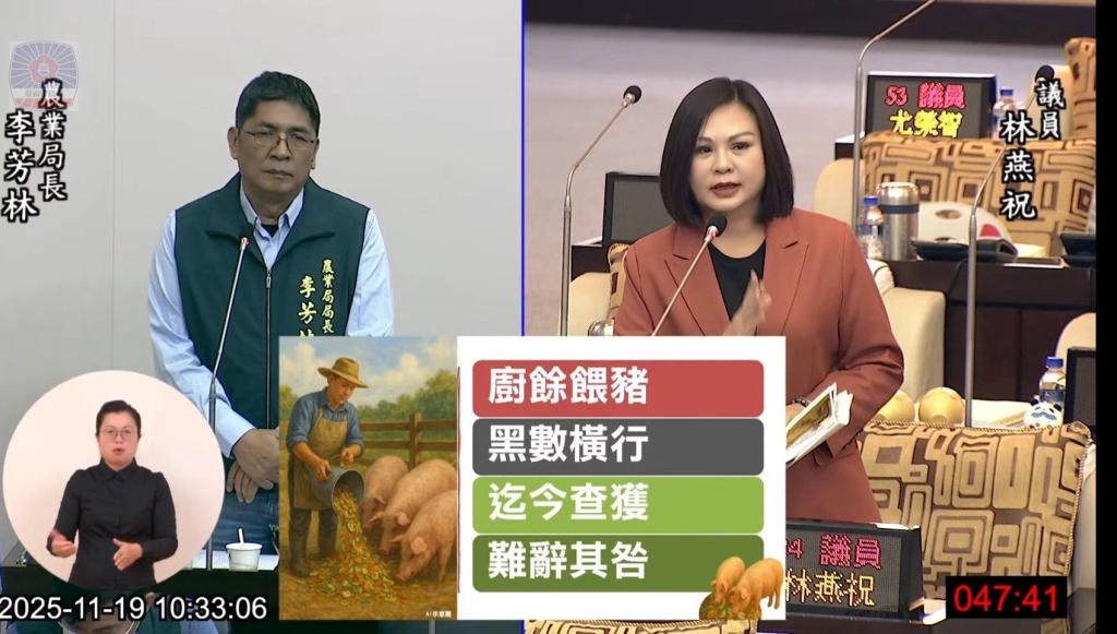 為防範非洲豬瘟疫情持續擴大,中央已公告自10月22日起全面禁止使用廚餘養豬。林燕祝踢爆並表示,有業者至今仍是違反禁令,從她秀出照片和影片中可清楚看到殘破豬舍裡桶中滿滿熟廚餘,環境髒亂不堪,豬舍周圍堆放許多非法棄置營建混合物和瀝青,民眾已多次檢舉遭漠視,直到她收到陳情協助才開始有積極作為,且這個養豬場也未取得畜牧場登記或飼養登記證,主管機關沒辦法對其撤證,到底全市還有多少廚餘養豬橫行黑數,她要求市府相關單位應落實稽查並從嚴裁罰,不要放任業者犯行,成為防疫破口。