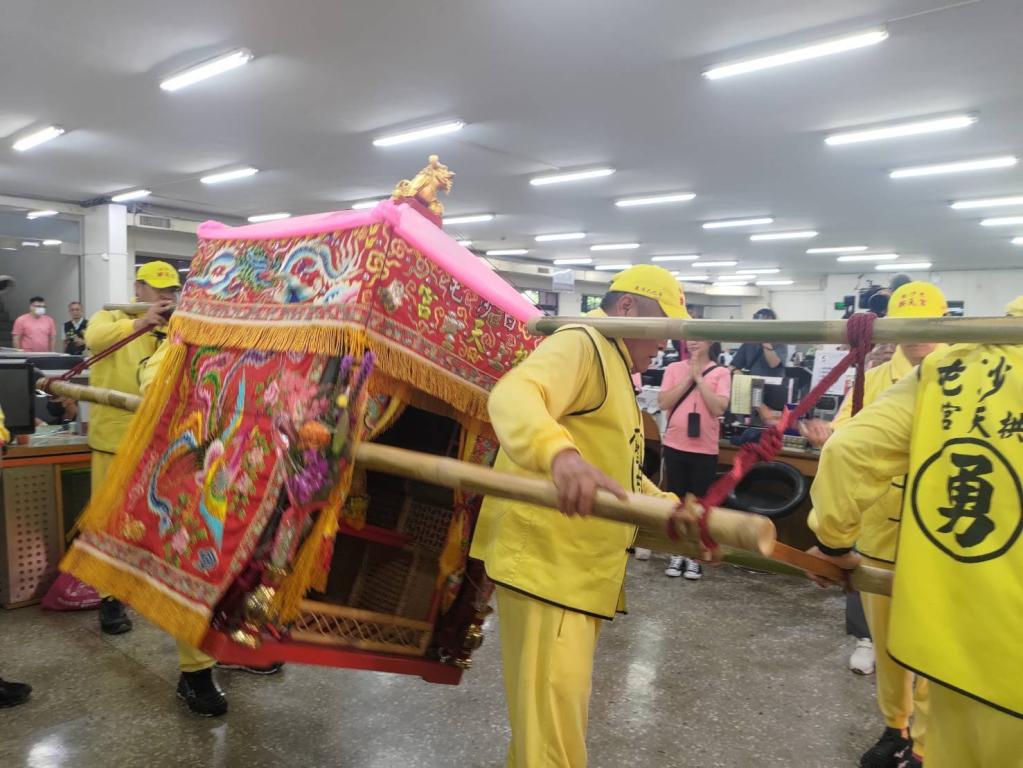 ▲「竹北超越竹北文化祭」於今日進入第二天高潮,白沙屯媽祖起駕,粉紅超跑突然「神迴轉」,進入市公所二樓市長室「看市長辦公」。(圖/竹北市公所提供)
