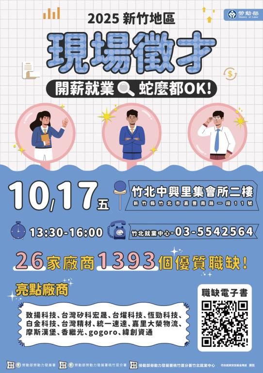 ▲桃竹苗分署竹北就業中心10/17(五)「2025年新竹地區現場徵才活動」邀請26家廠商,釋出1,393個優質職缺,歡迎有求職、轉職或是想重返職場的朋友來參加。(圖/桃竹苗分署提供)
