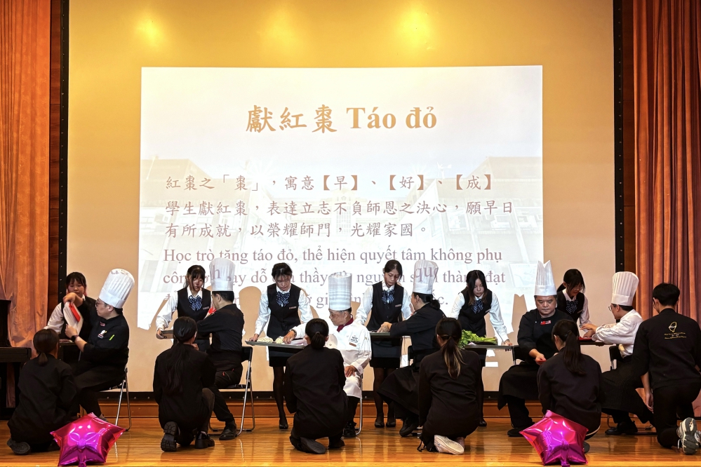 敏實科技大學餐飲管理系今(10/15)日於定一樓國際會議廳,隆重舉辦年度的「拜師禮」活動,全體餐飲系師生、越南南向班、國際專班、日本常磐大學及樂齡大學的同學共同參與,同時並特別邀請享譽國際的國宴主廚阿基師(鄭衍基)擔任嘉賓,突顯敏實科大校方非常重視這場拜師禮「達人薪傳、術德兼修」意義,而這場尊師重道的盛會,不僅傳承廚藝精髓,更注入職業精神與人文關懷,激勵學子在餐飲界砥礪前行。