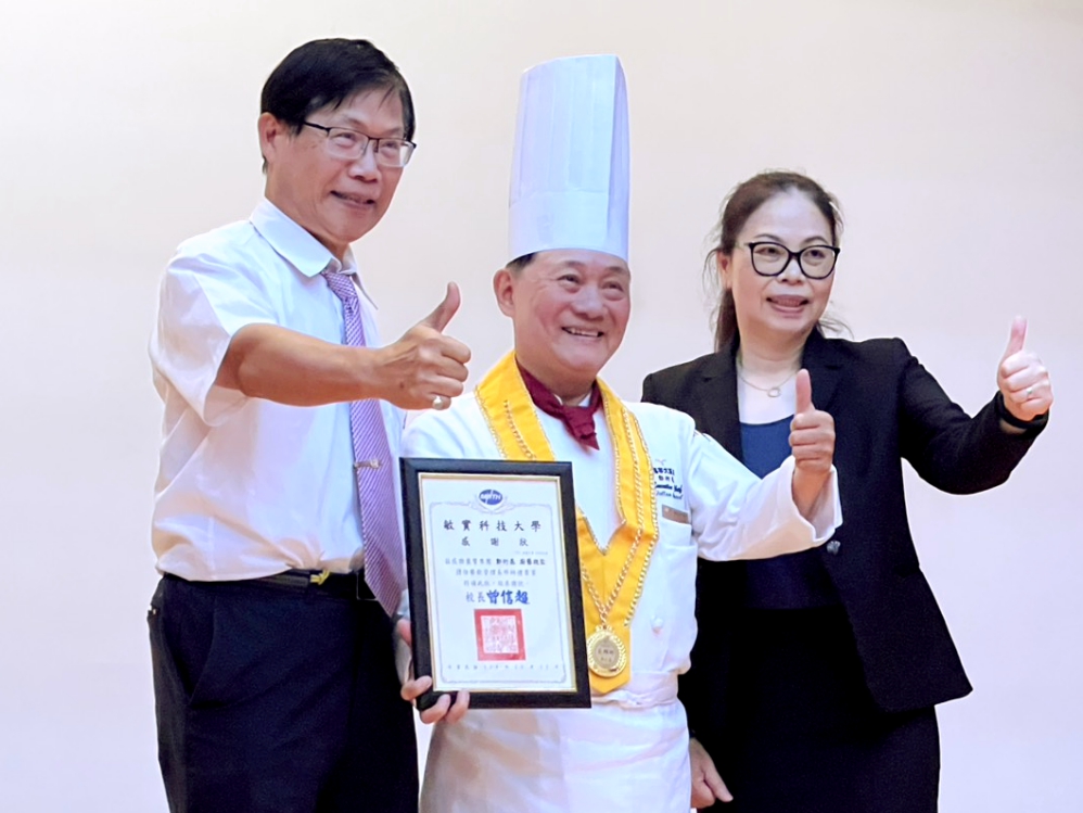 ▲敏實科大餐飲管理系隆重舉辦年度的「拜師禮」活動,圖左起:校長曾信超、國宴名廚阿基師、餐飲管理系主任徐雯珊一同合影。(圖/敏實科大提供)