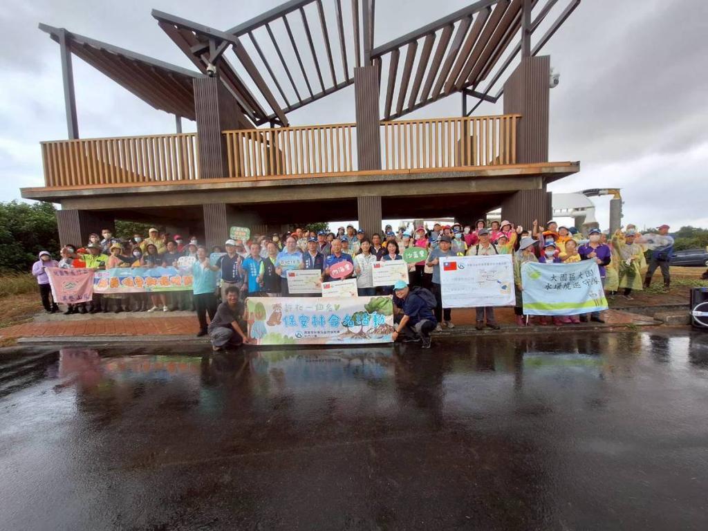 ▲桃園內海、沙崙、圳頭三里里長在參與活動場民眾共同見證下,由林業保育署新竹分署分署長夏榮生(左2)、三里里長共同頒發「大園濕地」保安林身分證,象徵即日起「大園濕地保安林」正式命名。 (圖/林保署新竹分署提供)