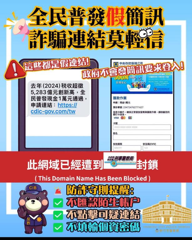 此外,竹市警方也提醒市民留意詐騙集團假借政府「普發現金1萬元」政策名義行騙。詐團常透過釣魚簡訊或惡意連結,引導民眾登入偽冒中央存保公司網站,輸入信用卡號、銀行帳號及個資進行詐騙;甚至假冒檢警,謊稱「有人冒用您的證件領取普發金」,再轉接假單位要求報案或加入LINE進行所謂「線上筆錄」。警方強調,政府機關絕不會要求民眾透過簡訊或網站提供個資、帳號或密碼,呼籲民眾提高警覺,防範詐騙陷阱,若接獲疑似詐騙訊息,應立即通報警方,或利用「165全民防騙網」、「網路詐騙通報查詢APP」進行通報。