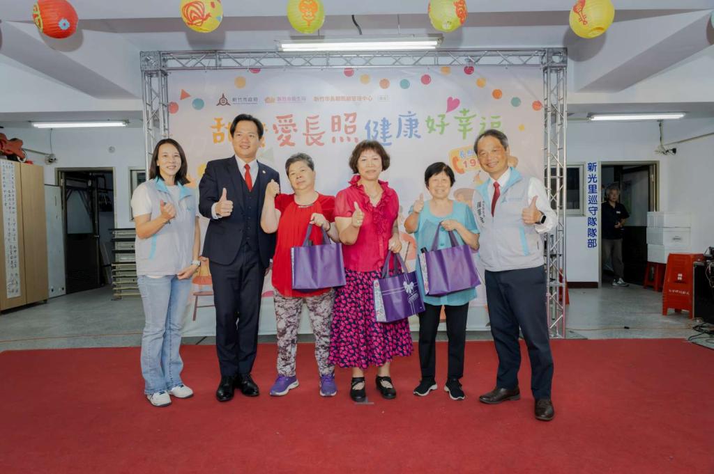 ▲新竹市「甜蜜愛長照,健康好幸福」長照巡迴宣導首場活動登場,代理市長邱臣遠(左2)、竹市衛生局長陳厚全(右1)與長輩合影留念。(圖/竹市府提供)