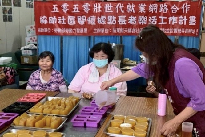 其中,苗栗天福宮社區照顧關懷據點自113年連續兩年參與本計畫,充分運用社區特色與在地資源,招募中高齡成員共同製作手工皂,並與鄰近露營區合作販售,成功打造地方創生的就業模式,不僅積極研發多樣產品,培訓社區中高齡製作產品技能,更創造工作機會,讓中高齡學習技能並重回職場,獲得實質報酬與成就感,並成功協助許多中高齡者重拾職場信心,順利就業,展現計畫深耕地方的實質效益,兼顧就業與社區共榮。