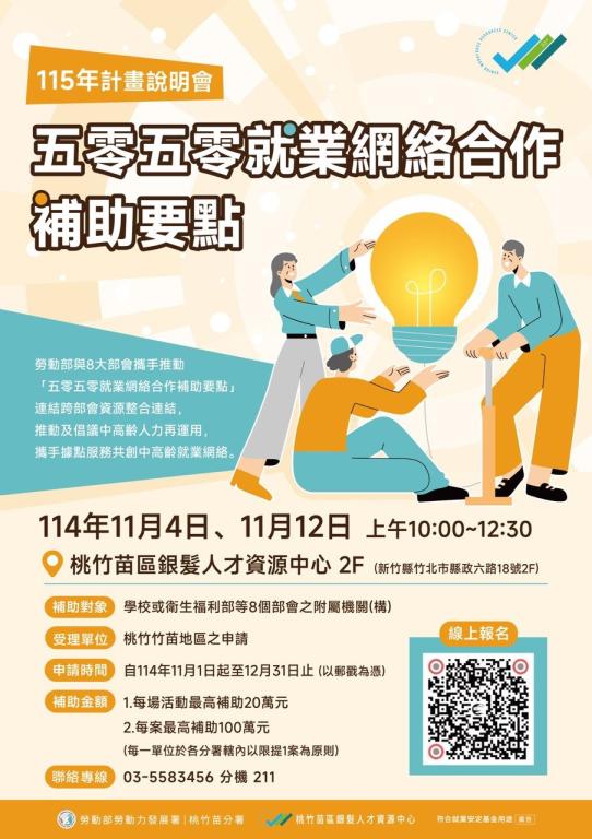 為促進中高齡者及高齡者勞動參與,勞動部推動「5050就業網絡合作計畫」連結衛福部、原民會、退輔會等8個部會據點資源,推動並倡議中高齡及高齡人力再運用,每案最高補助100萬元,勞動力發展署桃竹苗分署銀髮人才資源中心將於11月4日及11月12日辦理2場計畫說明會,邀請轄區單位一同加入桃竹苗中高齡及高齡者就業服務網絡,協助更多中高齡者重新進入職場,打造兼具友善與多元的就業支持體系。