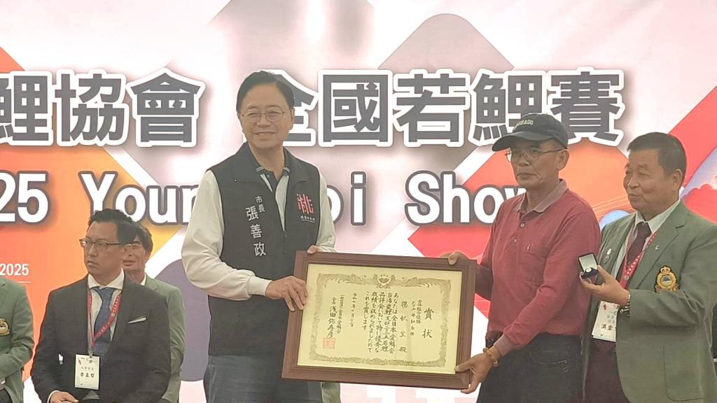 桃園市長張善政今(10/26日應中華愛鯉協會邀請,前往中原文創園區出席台灣錦鯉產業盛事「2025若鯉品評會」,參賽魚將區分作兩組,囊括6品種、10部別(體長公分)計有500隻以上若、幼鯉魚參賽;此次出賽的錦鯉中最小為15公分國產小錦鯉,最大則是63公分日本純正血統錦鯉。張市長特別頒獎祝賀全體總冠軍獲獎人楊秋金,也在中華愛鯉協會理事長李孟哲帶領下進行會場巡禮,進一步認識若鯉體態之美。