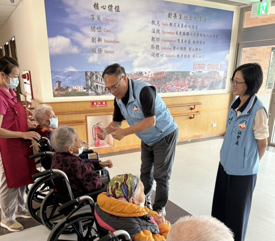 李文良副縣長除致贈加菜金表示關心及祝福外,並貼心囑咐長輩安心靜養,並向所有辛勞照顧工作人員致意,感謝平日無私奉獻,提前祝賀佳節快樂。