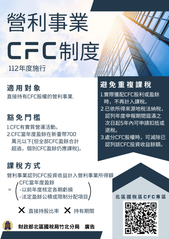 竹北國稅局呼籲,營利事業列報CFC當年度盈餘之外幣金額,應留意依規定匯率換算為新臺幣,以免遭補徵稅款。相關匯率可至財政部北區國稅局網站( https://www.ntbna.gov.tw )【路徑:首頁>主題專區>稅務專區>營利事業所得稅>營利事業受控外國企業(CFC)制度專區/10.匯率查詢(連結至稅務入口網)】查詢。