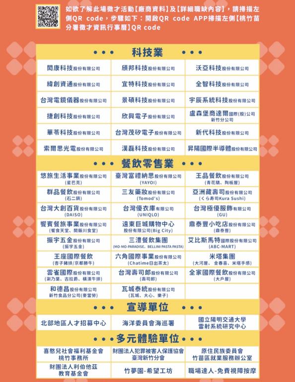 此次參與企業陣容堅強,科技業及連鎖餐飲服務業各占5成,包括科技大廠緯創資通、頎邦科技、宜特科技、景碩科技,知名餐飲業龍頭鼎泰豐、饗賓、王品、瓦城及日系服飾品牌UNIQLO等多家知名企業,職缺涵蓋系統研發、製程工程師、專案經理、行銷企劃、專業主廚、客服人員及門市人員等多項職類。
