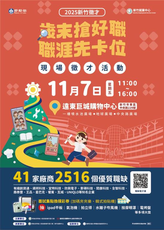 為協助新竹地區民眾找到理想工作,勞動部勞動力發展署桃竹苗分署新竹就業中心攜手遠東巨城購物中心共同辦理現場徵才活動,於11月7日上午11時00分至16時00分,在遠東巨城購物中心一樓噴水池廣場(新竹市東區中央路229號)舉辦2025新竹地區「歲末搶好職,職涯先卡位」現場徵才活動,邀集41家廠商,釋出2516個職缺,歡迎民眾踴躍參加,把握在地就業良機,凡參加這次活動並填寫求職登記表者,可獲得限量文件手提袋,且不只找工作還能抽大獎,面試越多中獎機會越高,抽獎總價值超過萬元。