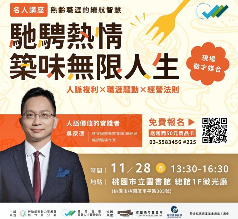 面對勞動市場與社會結構的轉變,如何激勵中高齡及高齡者延續職涯、重返職場,已成為當前重要課題。為協助中高齡及高齡者開拓職涯新方向、強化人際連結與社會參與,桃竹苗分署將於11月28日(星期五),在桃園市立圖書館總館一樓微光廳舉辦【職涯心指引:馳騁熱情.築味無限人生】名人講座,特別邀請唯賀國際餐飲集團吳家德總經理蒞臨分享,期望透過他的人生故事與經驗,啟發熟齡世代以行動續寫人生下半場的精彩篇章。
