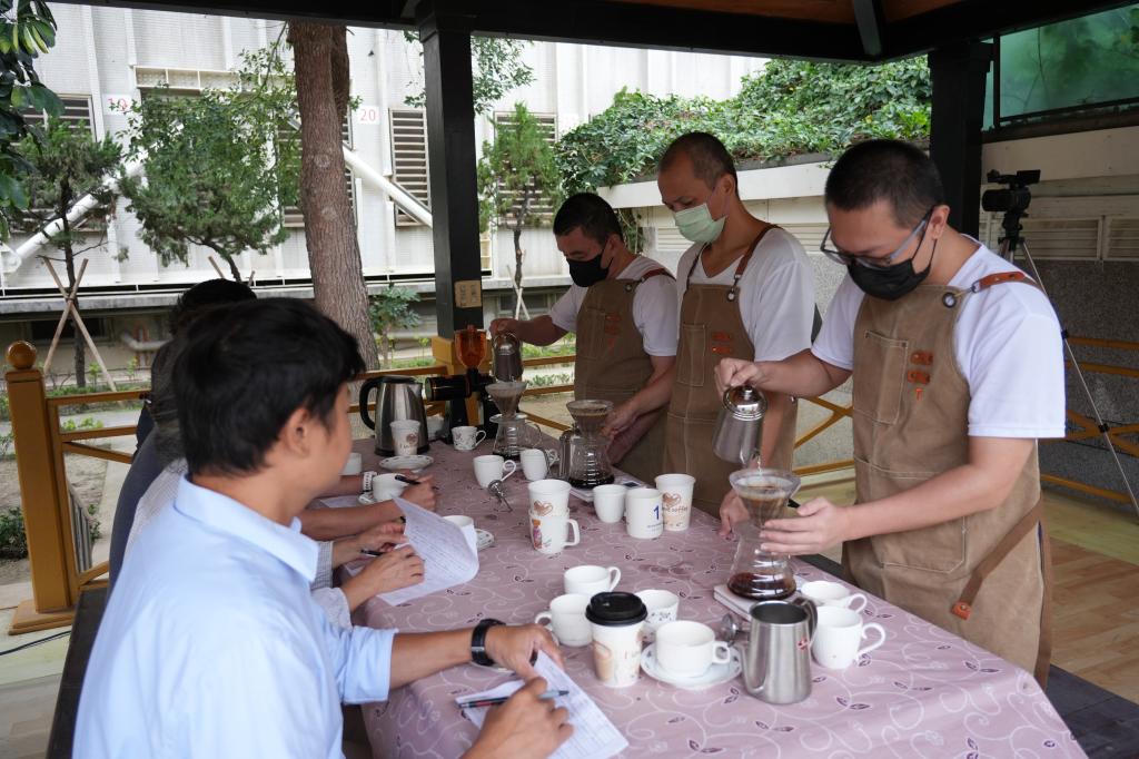 ▲新竹監獄第二期「手沖咖啡技能訓練班」結訓典禮,評審老師評鑑學員沖煮的咖啡。(圖/新竹監獄提供)