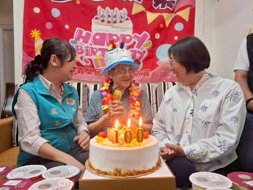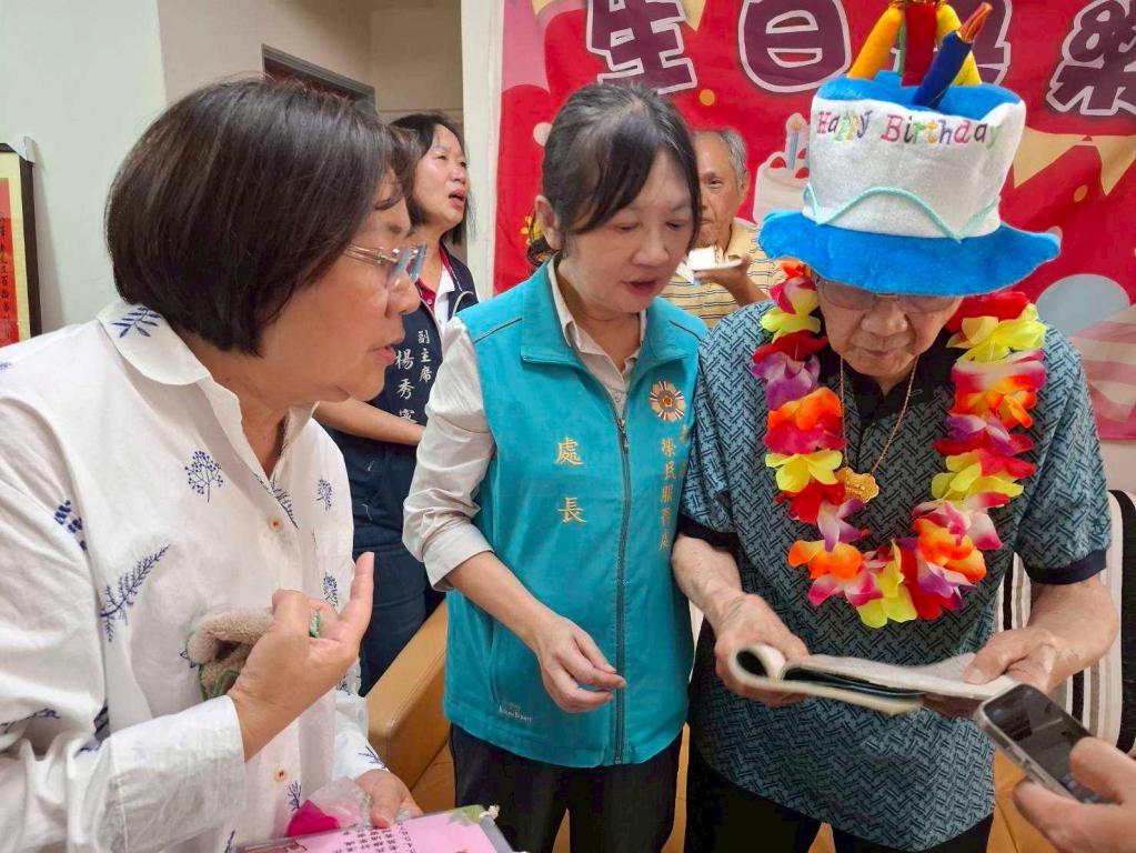 【勁報記者于郁金/嘉義報導】嘉義榮服處為居住嘉義縣民雄鄉榮民唐伯伯歡喜賀紀壽,由處長許淑菁特率社區志願服務組長、替代役及榮欣志工們,偕同嘉義縣民雄鄉公所林于玲鄉長、簡嘉億議員、民雄鄉民代表會楊秀密副主席、社會課陳秋蓉課長、東榮村張金富村長到長輩家中賀壽,與唐伯伯與子女、女婿們共同歡慶唐伯伯百歲壽辰,氣氛溫馨。