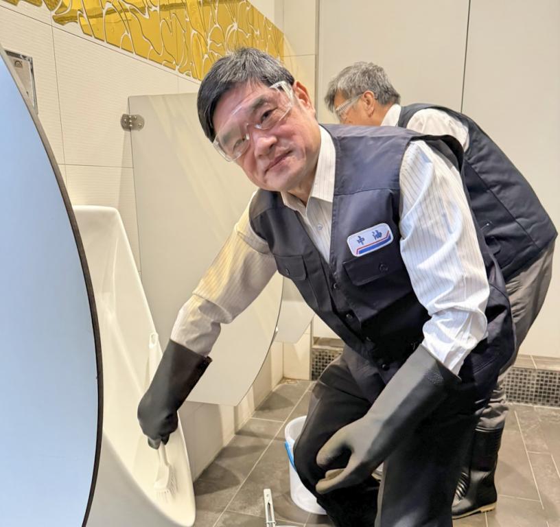▲台灣中油今日在竹市公道五加油站盛大舉辦「2025年世界廁所日:來中油,好方便」公廁清潔總動員活動,台灣中油副總經理羅博童及貴賓一同著裝帶頭彎腰清洗廁所。(圖/台灣中油提供)