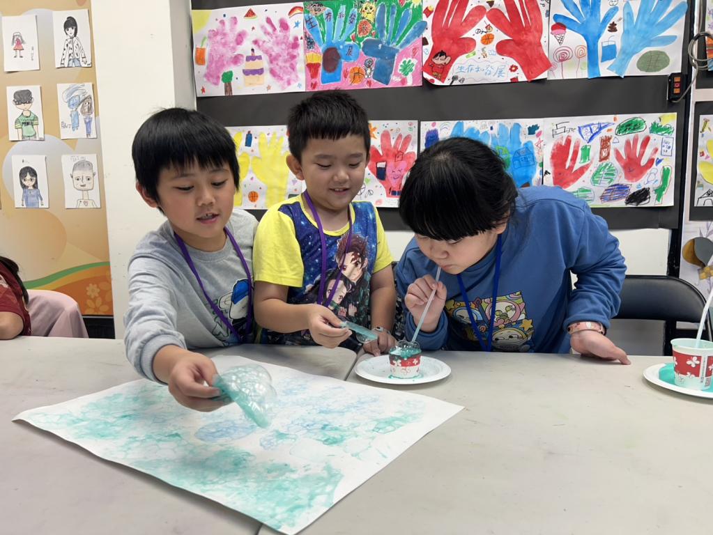 ▲創作中以吹泡泡作畫象徵海洋融合在藝術創作中。(圖/台灣世界展望會提供)