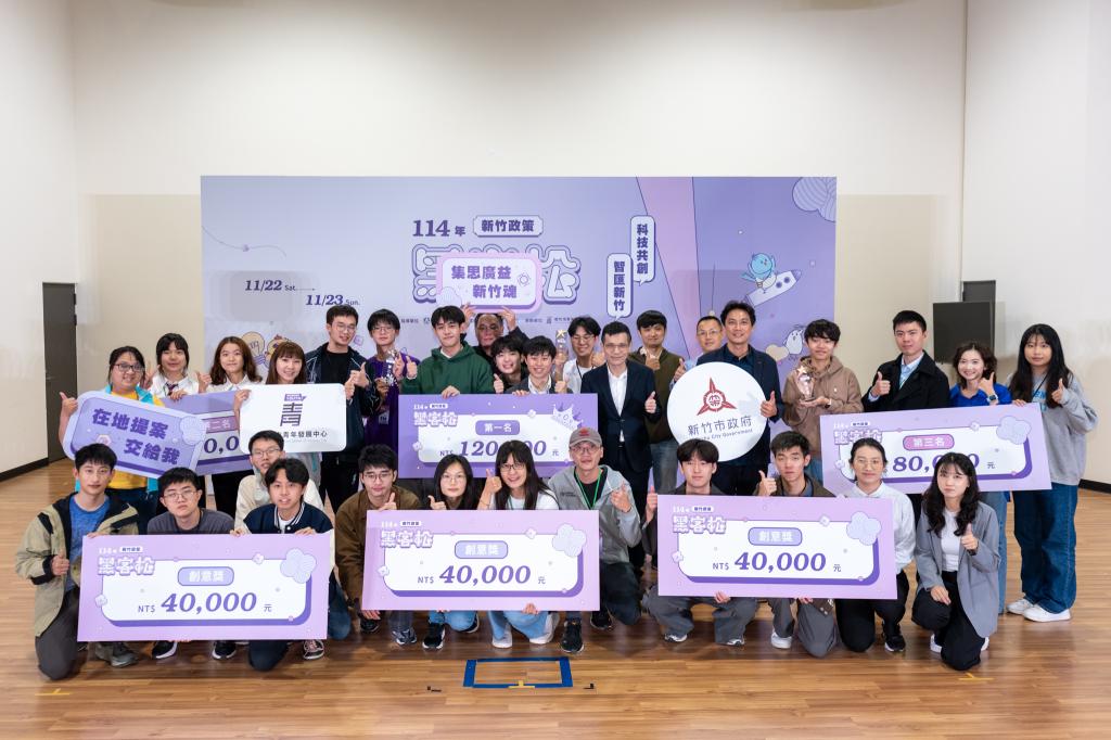 ▲竹市府首辦「114 年新竹政策黑客松」競賽活動圓滿謝幕,得獎隊伍大合照。(圖/竹市府提供)
