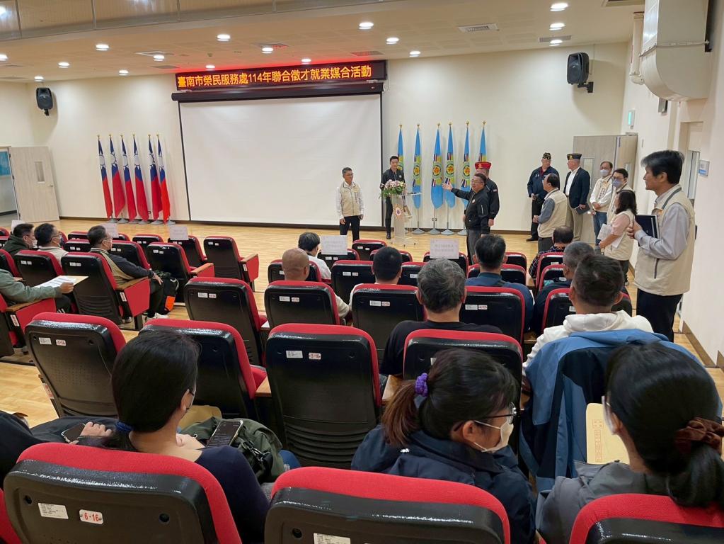 首先引導參觀榮服處各項服務設施,隨後由榮服處進行業務簡介,並播放服務成果影片,正逢臺南市榮服處是日辦理就業媒合活動,懷利總會長更與蒞處就業媒合我國榮民、第二類官兵親切問候,熱心了解現場說明廠商業務與背景,受到大家熱烈歡迎。
