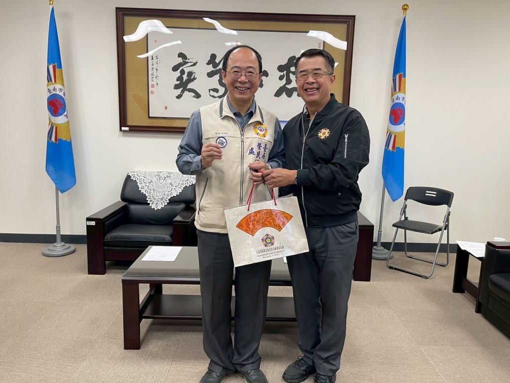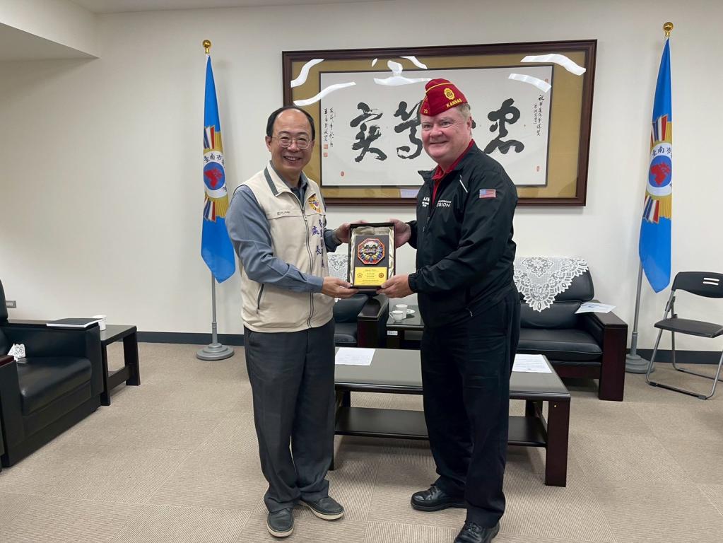 【勁報記者于郁金/臺南報導】美國退伍軍團協會懷利總會長一行,28日由輔導會參事倪邦臣陪同拜訪臺南醫養服務三合一園區-臺南市榮民服務處,處長王國能率領單位主管親自迎接,並致贈代表臺南安平特有吉祥物「安平劍獅」,誠摯歡迎及感謝美國退伍軍團協會總會長懷利率團蒞臨參訪。