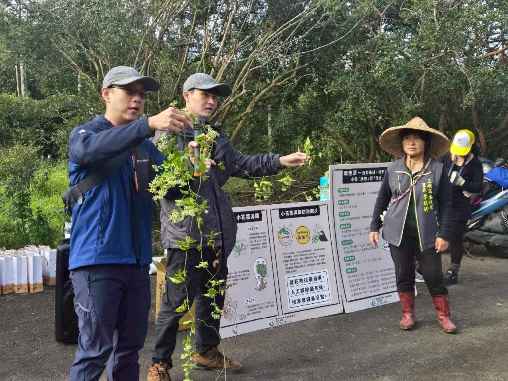 因此,新竹分署所屬各地區工作站全方面推動全民剷除漫延山林田野的小花蔓澤蘭,除了透過政策說明會、座談會宣導外,更積極與在地社區、私有地地主,以及公民團體等共同合作,帶領民眾實地動手移除。