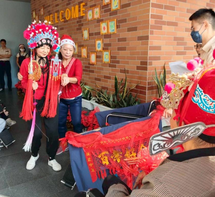 活動自戶外開始,工作人員布置喜字氣球、椅列及迎親道具,包括小鑼、嗩吶、彩帶加油棒、鞭炮及聖誕帽等,營造強烈節慶感;隨著樂曲響起,新郎、新娘與媒人婆隆重登場,長輩們手持道具跟著節奏拍手、搖動或敲擊;這些「節奏呼應」與「聽覺刺激」正是音樂輔療重要技巧,有助於提升失智長輩動機、活化腦部刺激與促進社交互動。