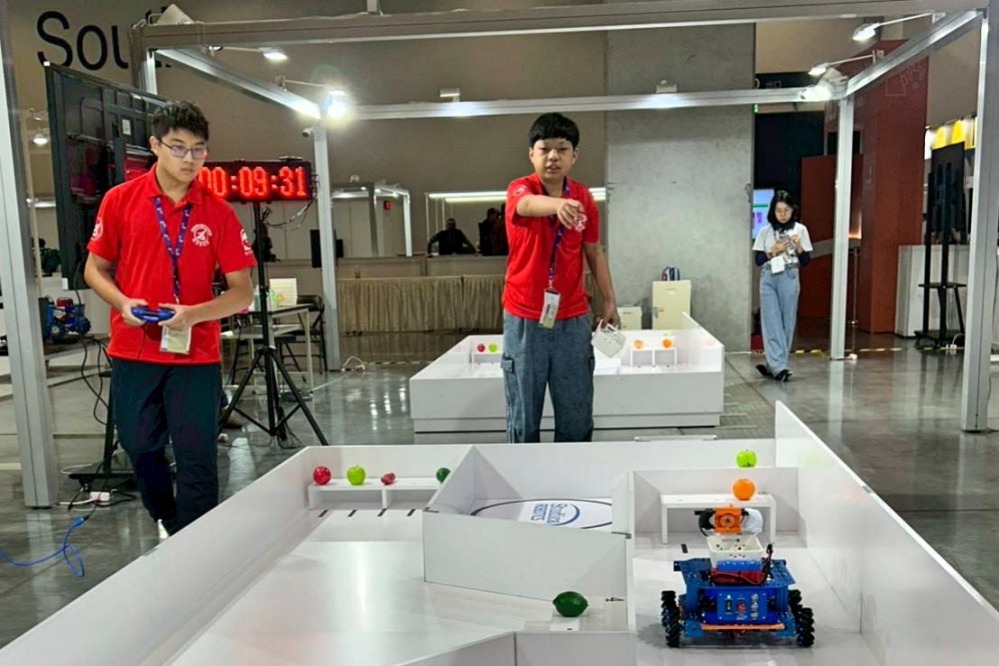 ▲桃竹苗分署培訓的「自主移動機器人」 青少年組國手鄭宇翔及莊致齊同學兼搭檔默契十足,亞洲賽成功奪金。(圖/桃竹苗分署提供)
