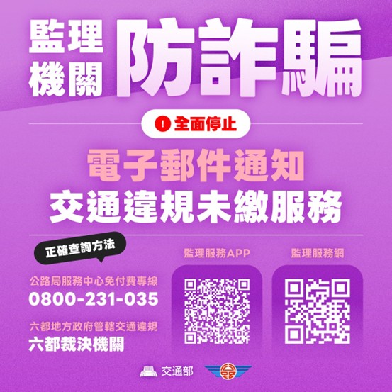 新竹區監理所提醒民眾特別注意,自114年8月12日起全面停止使用電子郵件通知民眾交通違規未繳罰鍰等相關資訊,所以只要民眾收到任何催繳罰單的電子郵件絶對是詐騙,請民眾皆不要任意點選開啟,以免受騙。