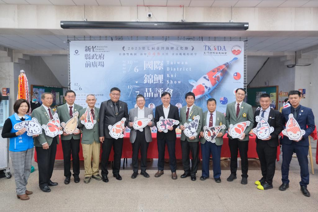 ▲2025第七屆臺灣錦鯉文化節暨國際品評會12月6日至7日在新竹縣政府前廣場盛大登場,12/5舉辦宣傳活動,楊文科縣長(左6)和與會貴賓邀請全國民眾闔家蒞臨共襄盛舉,一同感受錦鯉躍動之美。(圖/竹縣府提供)