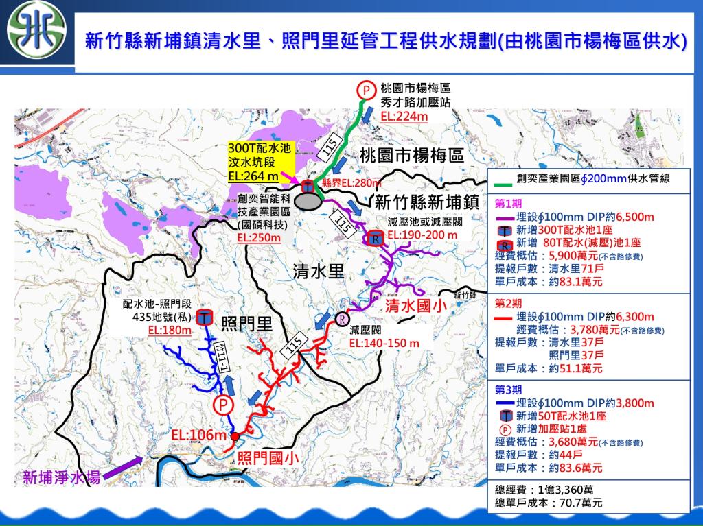 搭配配水池興建,自來水公司提出新竹縣新埔鎮清水里、照門里延管工程供水規劃,將從海拔264公尺的清水里配水池一路接管至海拔106公尺的照門里區域,工程分三期進行,總經費1.3億元,能造福189戶家庭。