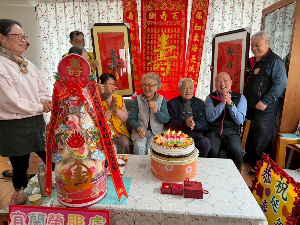 活動現場布置溫馨喜慶,大家圍繞在百歲榮民身邊,送上最真摯祝福;慶生活動上,宜蘭縣榮民服務處處長親自送上賀詞,並贈送總統與行政院院長壽屏、國軍退除役輔導委員會百歲金飾、生日蛋糕、壽桃及壽麵等,表達對百歲榮民長期以來為國家、為社會無私奉獻感謝。