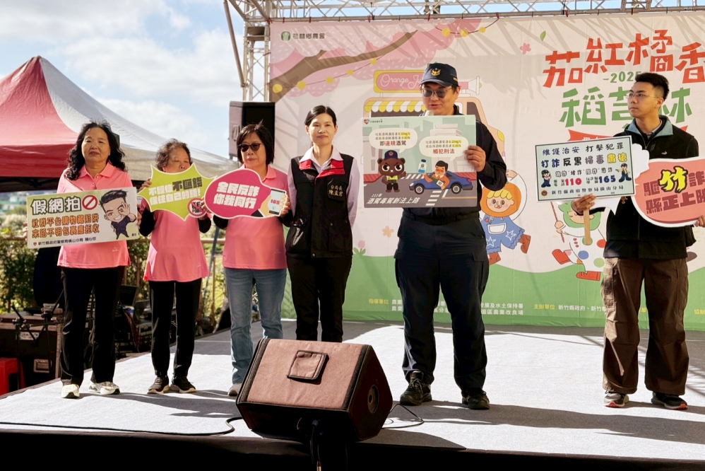 ▲芎林鄉農會茄紅橘香稻芎林番茄產業文化活動,竹縣警橫山分局分局長陳孟君利用這次機會,與分局同仁共同登台,向來參與活動的民眾進行反詐騙及反毒駕等治安、交通安全宣導。(圖/竹縣警察局提供)