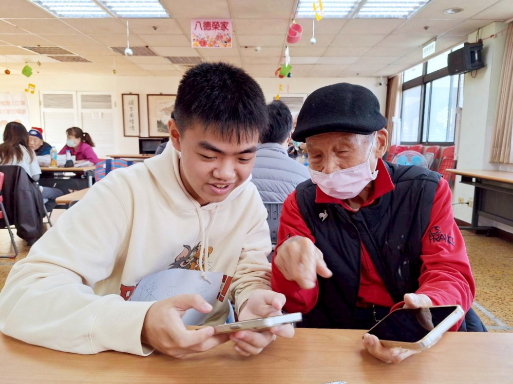 ▲臺大學生透過手機照片分享校園生活點滴,與榮家長輩進行跨世代的「時空對話」,現場互動溫馨熱絡。(圖/八德榮家提供)
