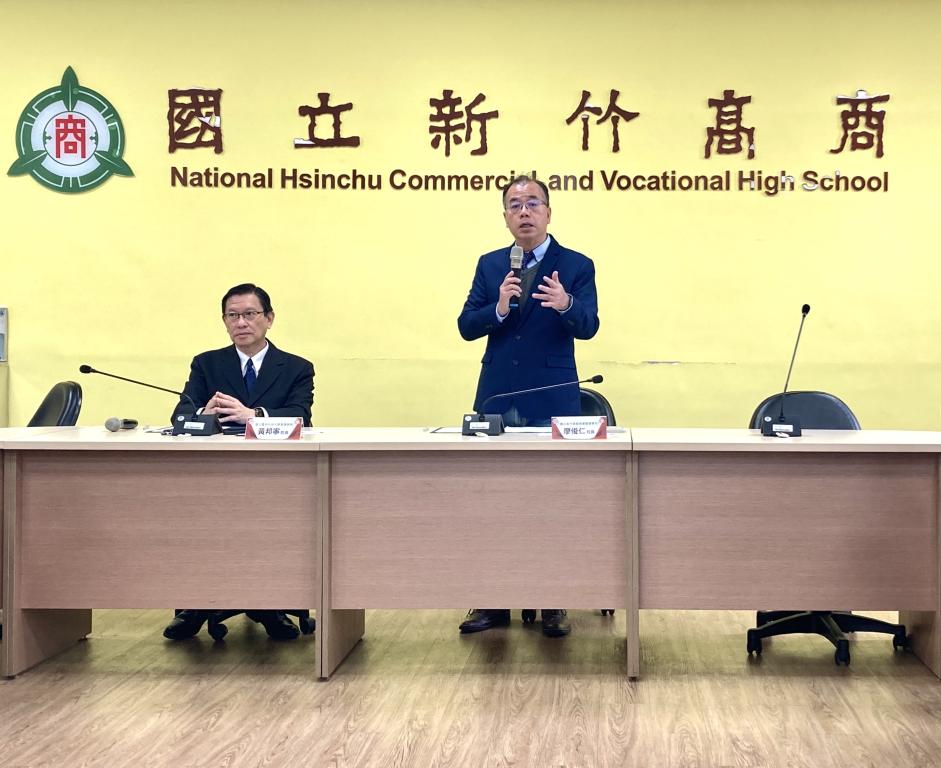 ▲新竹高商與雲林科大舉行課程合作備忘錄簽署儀式,新竹高商校長廖俊仁(右)致詞。