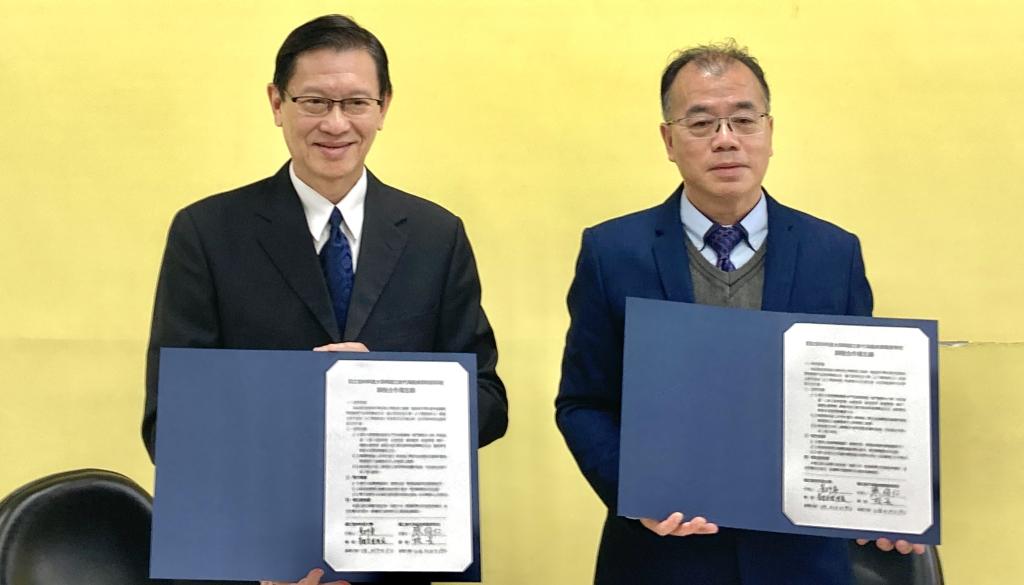 ▲新竹高商校長廖俊仁(右)與雲科大管理學院院長黃邦寧(左)代表兩校正式簽署大學先修課程合作備忘錄。