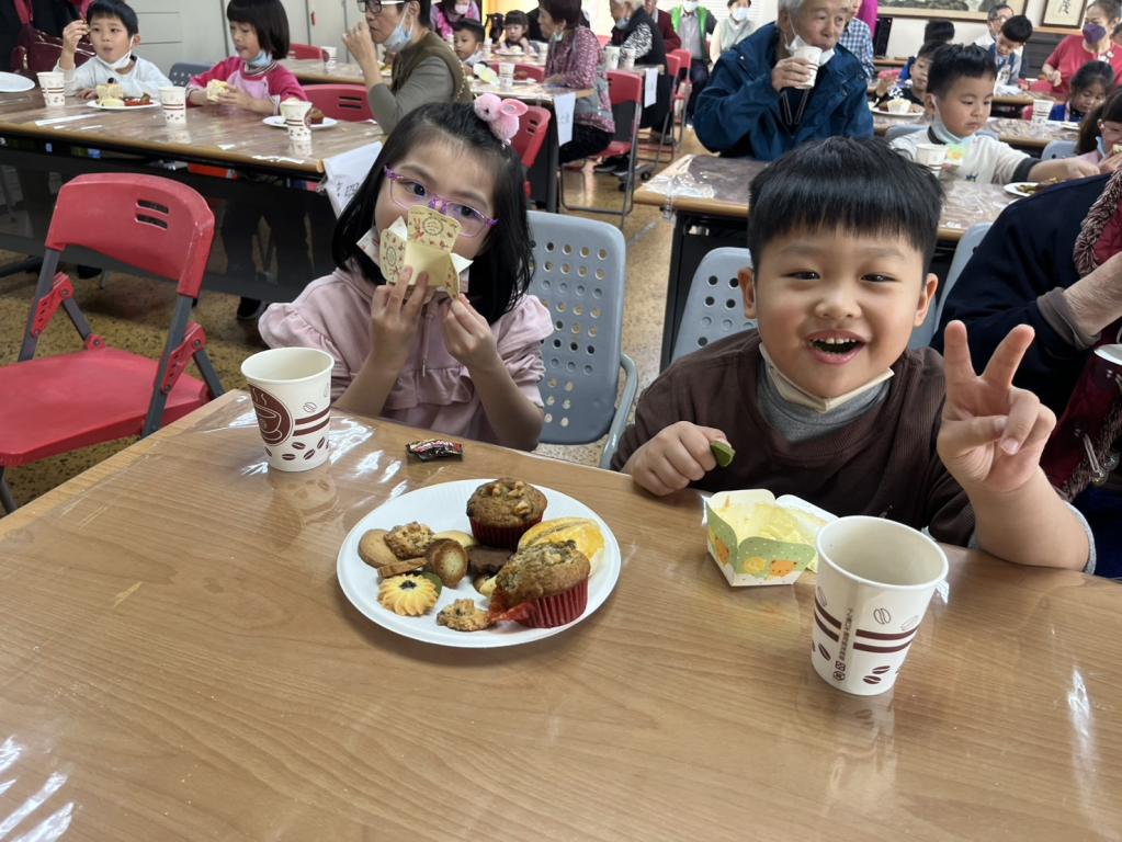 ▲八德榮家舉辦烘焙社成果展搭起跨世代共融同樂的橋樑,加貝爾幼兒園的孩童開心品嚐剛出爐的烘培食品司康與糕點,孩子們臉上滿足的笑容與活潑的模樣,為八德榮家注入了滿滿的青春活力與歡笑聲。(圖/八德榮家提供)