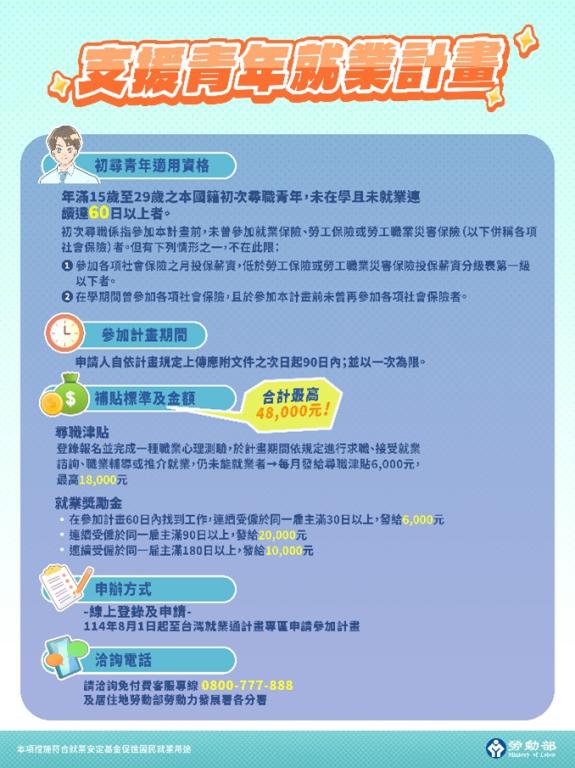 初次尋職青年在台灣就業通網站「支援青年就業計畫」報名專區( https://gov.tw/Dgp )完成報名後,只要在90天內依規定接受就業輔導措施並完成求職提供相關紀錄,即可申請每月6,000元的尋職津貼,最多可領3個月,共1萬8,000元;如果在90天內順利受僱全時工作,並於該職務穩定就業滿90天或180天,就可分別申請2萬元及1萬元的就業獎勵金,兩項補助合計最高可達4萬8千元,協助青年能安心尋職、穩定就業。