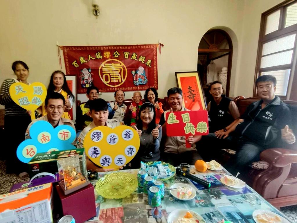 【勁報記者于郁金/臺南報導】榮民繆立生爺爺迎來百歲榮壽,臺南市榮服處處長王國能18日偕同責任區輔導員、榮欣志工與替代役服務團隊,並邀請南化里余振輝里長等,至繆爺爺家裡舉辦溫馨莊嚴百歲慶生會;王處長並代表政府致贈總統與行政院長祝賀壽屏,及輔導會贈送琉璃壽桃金飾,以象徵國家對其戎馬半生誠摯敬意。