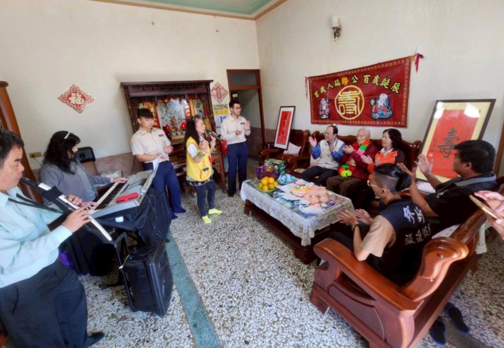 為讓百歲慶生更具溫度與活力,榮服處特別邀請取得街頭藝人證照同仁薩克斯風及電子琴獻藝,為老壽星獻上一場細緻動人音樂饗宴。